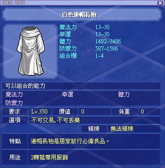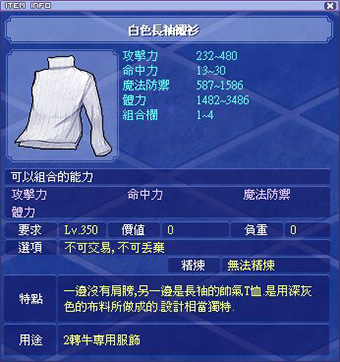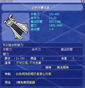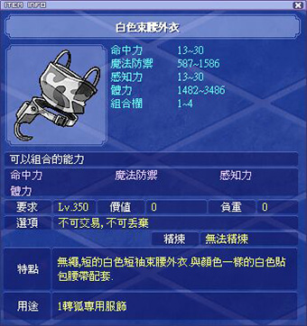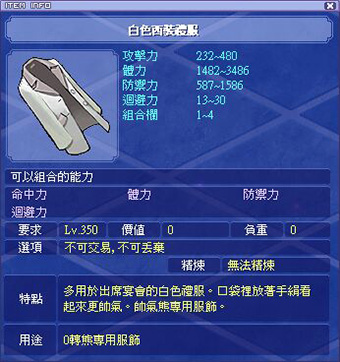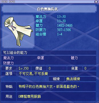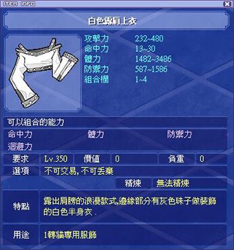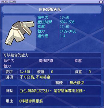 各職業能力時裝衣服部位外觀和屬性如下: