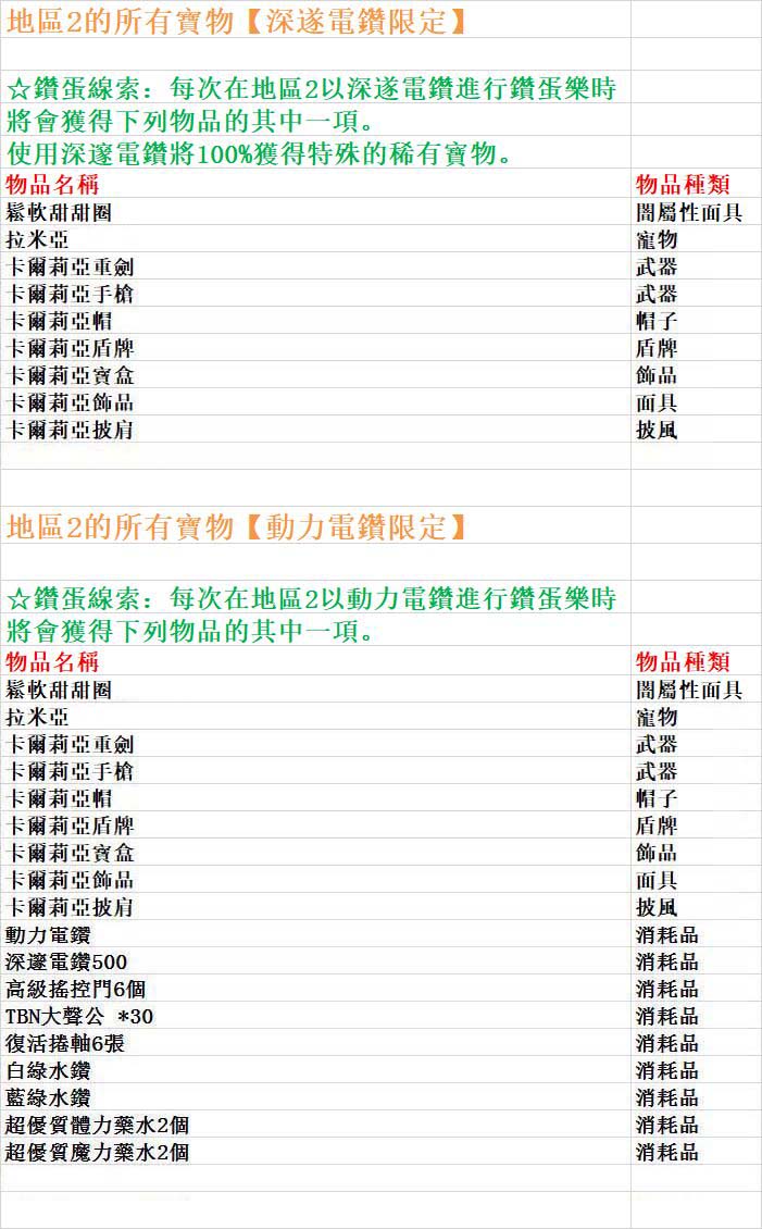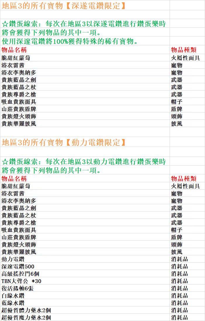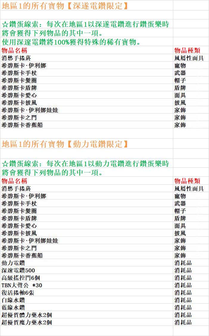 台服卡巴拉島第75期鑽蛋,四個區寶物詳情如下: